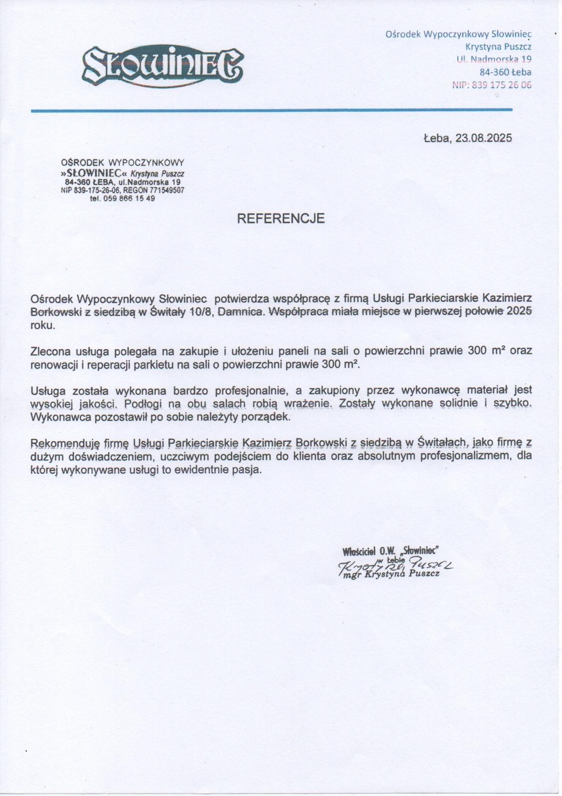 Ośrodek Wypoczynkowy Słowiniec potwierdza współpracę z firmą Usługi Parkieciarskie Kazimierz Borkowski z siedzibą w Świtały 10/8, Damnica. Współpraca miała miejsce w pierwszej połowie 2025 roku.