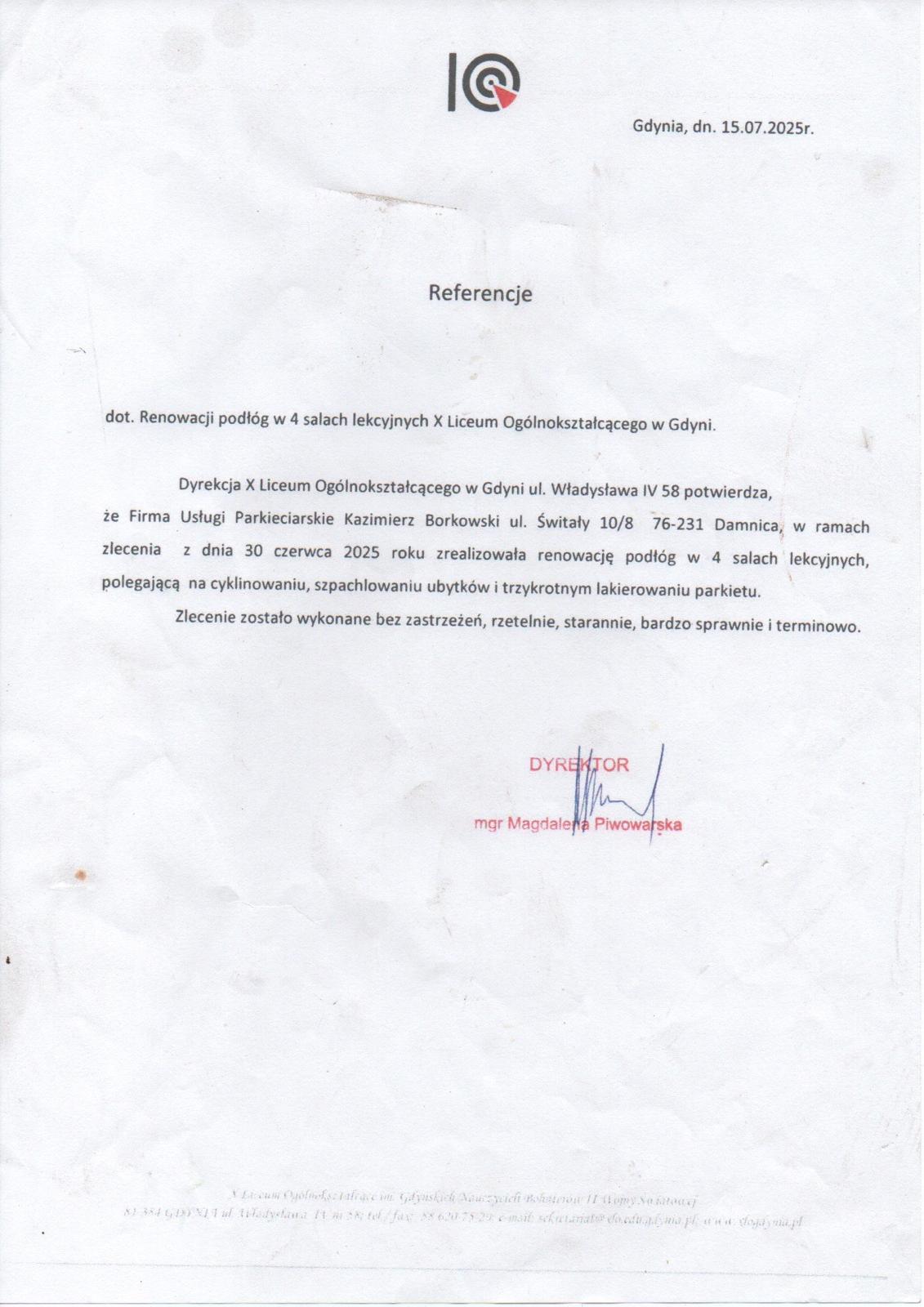 Dyrekcja X Liceum Ogólnokształcącego w Gdyni ul. Władysława IV 58 potwierdza, że Firma Usługi Parkieciarskie Kazimierz Borkowski ul. Świtały 10/8 76-231 Damnica, w ramach zlecenia z dnia 30 czerwca 2025 roku zrealizowała renowację podłóg w 4 salach lekcyjnych, polegającą na cyklinowaniu, szpachlowaniu ubytków i trzykrotnym lakierowaniu parkietu.