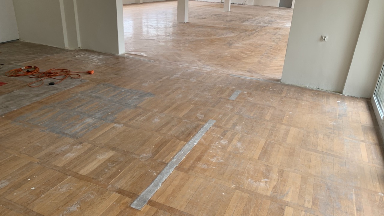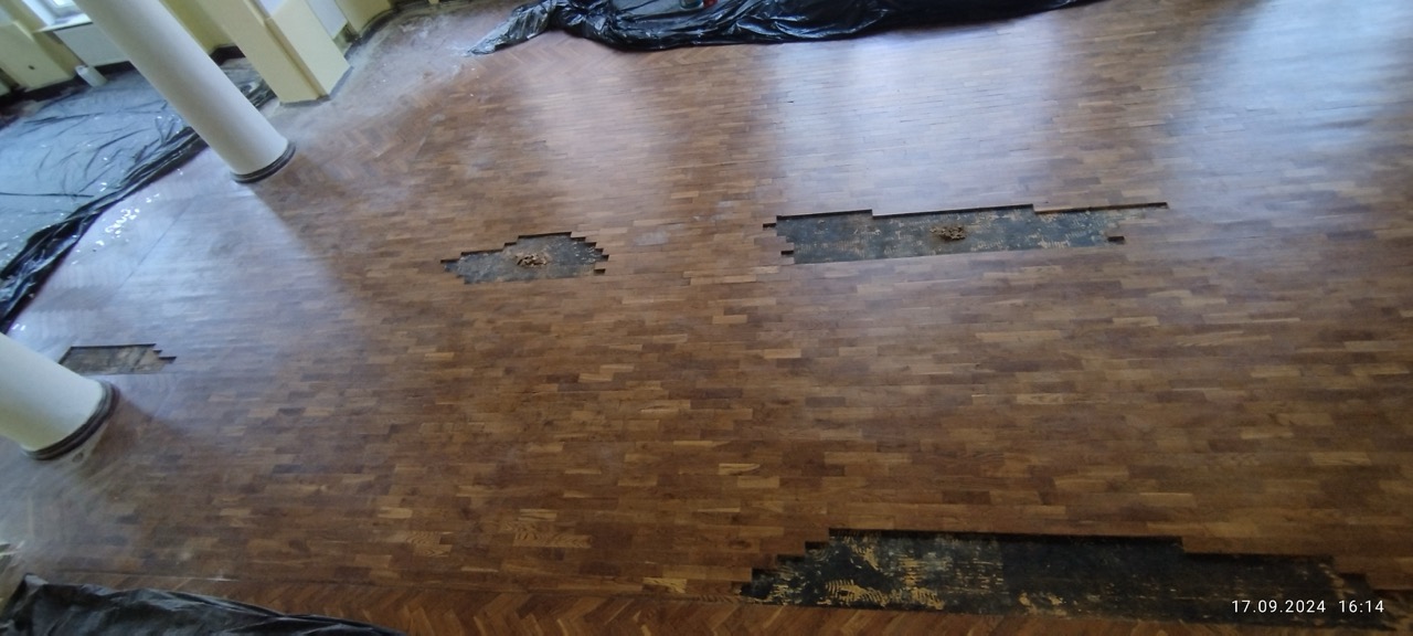 Dzięki firmie Usługi parkieciarskie stara zniszczona podłoga Sali Kolumnowej wygląda jak nowa.